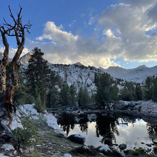 Then Rae lakes is like walking into Rivendell, or at least what seems to be our best shot at the forest paradise in the west. Waterfalls that grace the rim of finely carved grey white granite with natural painted streaks of color. Lush evergreen pillars stand tall over the shores of turquoise blue waters reflecting the pointed peaks high above into the dotted cloudy sky.