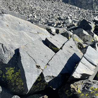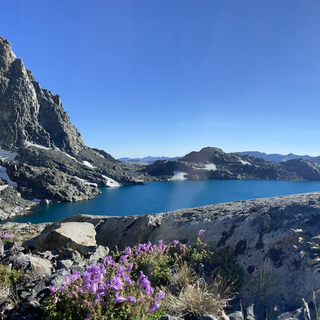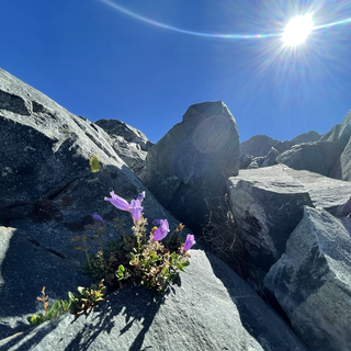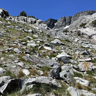 Some tough and questionable moves, but I think the IBSF (International Boulder Scampering Federation) would allow stepping on some small gravel spots between larger boulders in order to progress to the bigger guys up the hill. It’s just very important to the official rules to stay on track and really leave no footprints down there, you’re really disqualified if you manage to crush or mangle a delicate red Indian paintbrush or maybe accidentally tackle a blue lupin bush. Maybe on the way down I will hang a bit higher to the left on the rocky hill before dropping back down into camp.
